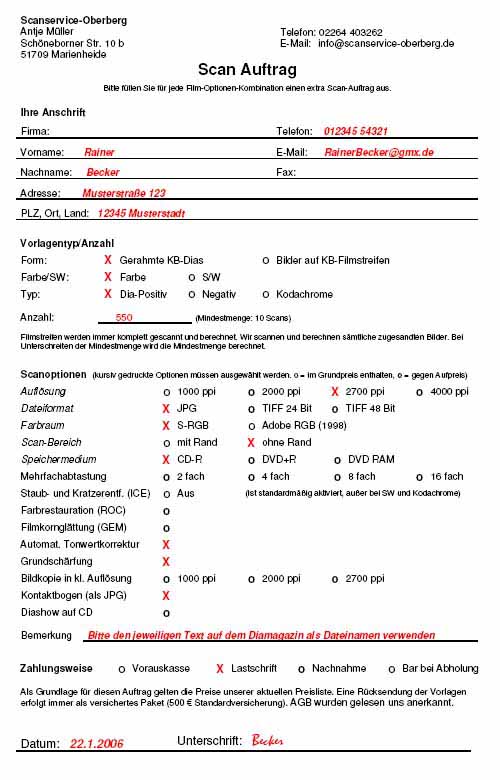 6. Drucken Sie jeweils für jede Auftragsart (z.B. Dias 2000 ppi, Dias 4000 ppi, Negative 2000 ppi) ein separates Auftragsformular bzw. Auftragsformular Sonderaktion aus. Füllen Sie es bitte aus und unterschreiben es. Hier sind zwei Beispiele ausgefüllter Auftragsformulare. Beispiel1 ist typisch für einen Scan-Auftrag, bei dem die Scans z.B. mit Photoshop noch nachbearbeitet werden sollen. Beispiel2 ist typisch für einen Auftrag, bei dem die Scans nicht mehr groß nachbearbeitet werden sollen, sondern direkt mit PC, Beamer oder TV gezeigt werden sollen. Packen Sie das Formular zu den entsprechenden Magazinen bzw. Hüllen. Machen Sie bitte ersichtlich welche Vorlagen zu welchem Formular gehören. Haben Sie ein individuelles Angebot von uns erhalten, beziehen Sie sich bitte darauf.
